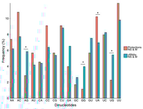 As a general trend, dinucleotides containing at least one G residue were less frequent in the protected regions than in the whole of the NS and M vRNAs, and this difference was significant for three of them (AG, GG, UG) (Figure 6). On the contrary, the dinucleotide UA was significantly more frequent in the protected regions compared to the whole NS and M vRNA sequences (Figure 6). Quite surprisingly, the frequency of the CU and UC dinucleotides was similar in the protected regions and the NS and M vRNA sequences (Figure 6), even though C and U residues were over-represented in the short and long-protected regions, respectively (Figure 5a).