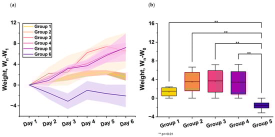 The figure shows body weight changes in mice across 6 treatment groups 6 days post-infection: Group 1—Viral control mice injected with physiological solution. Group 2—Mice treated with 250 μg/kg “Immeran” before infection. Group 3—Mice treated with 500 μg/kg “Immeran” before infection. Group 4—Mice treated with 250 μg/kg “Immeran” after infection. Group 5—Mice treated with 500 μg/kg “Immeran” after infection. Group 6—Mice treated with Favipiravir. (a) Changes in body weight of Syrian hamsters infected with SARS-CoV-2 in dependence on the treatment regimen in the first series of the experiments. The weight of the animal before infection was taken as 100%. (b) Daily animal weight measurements were normalized, with baseline weight (W1) minus the weight measured daily (Wn). Statistical comparisons between groups were performed using unpaired Student’s t-test (p < 0.05, n = 35) with Bonferroni adjustment for multiple comparisons. Error bars denote 95% confidence intervals calculated using Student’s t-distribution, indicating the likely range of true mean weight change.