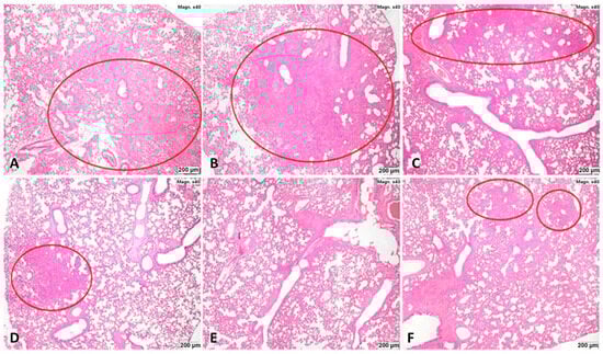 Histopathology of hamster lungs on the 4th day after infection with SARS-CoV-2: (A)—group 1 (viral control group), (B)—group 2–250 μg/kg of “Immeran” 24 h before infection, (C)—group 3–500 μg/kg of “Immeran” 24 h before infection, (D)—group 4–250 μg/kg of “Immeran” 1 h after infection and four days once every other day, (E)—group 5–500 μg/kg of “Immeran” 1 h after infection and four days once every other day, (F)—group 6 (favipiravir control). Foci of interstitial pneumonia in the respiratory lobe of the right lung (red ovals). Magnification ×40. Hematoxylin and eosin staining. The statistical analysis for the table is presented in the Supplementary Material.