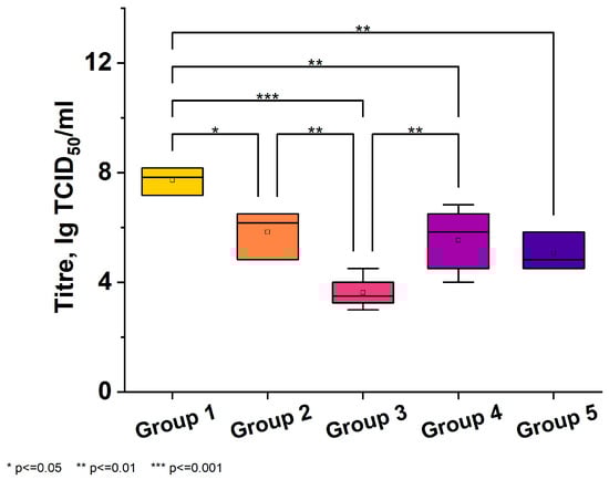Treatment with 500 μg/kg (Group 3) significantly suppressed the multiplication of the virus in the lungs of the animals (3.20 lgTCID50/mL) and protected them from weight loss (Figure 5).