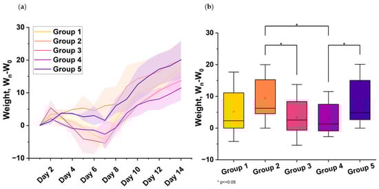 The figure shows body weight changes in infected mice across 5 treatment groups 14 days post-infection: Group 1—Viral control—mice injected with physiological solution. Group 2—Mice treated with 1000 μg/kg “Immeran” before infection. Group 3—Mice treated with 500 μg/kg “Immeran” after infection daily. Group 4—Mice treated with 500 μg/kg “Immeran” after infection every other day. Group 5—Mice treated with 1000 μg/kg “Immeran” after infection every other day. (a) Changes in body weight of Syrian hamsters infected with SARS-CoV-2 in dependence on the treatment regimen in the second series of experiments. The weight of the animal before infection was taken as 100%. (b) Animal daily weight measurements were normalized, with baseline weight (W0) minus the weight measured daily (Wn). Statistical comparisons between groups were performed using unpaired Student’s t-test (p < 0.05, n = 35) with Bonferroni adjustment for multiple comparisons. Error bars denote 95% confidence intervals calculated using Student’s t-distribution, indicating the likely range of true mean weight change.