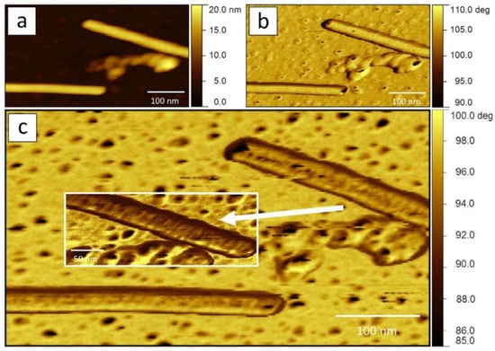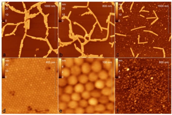 - Dubrovin, E.V.; Kirikova, M.N.; Novikov, V.K.; Drygin, Y.F.; Yaminsky, I.V. Study of the Peculiarities of Adhesion of Tobacco Mosaic Virus by Atomic Force Microscopy. Colloid. J. 2004, 66, 673–678. [Google Scholar] [CrossRef]