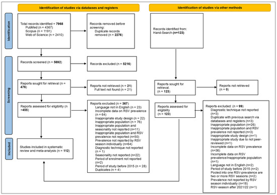This study examined children aged 0–18 years hospitalized with RSV-related LRTIs, excluding nosocomial infections. RSV diagnosis was confirmed using immunofluorescence, antigen testing, or molecular assays. The prevalence of RSV hospitalizations was assessed for each winter season; studies in which pooled data from several seasons were reported were excluded. Peer-reviewed observational studies (cohort, case–control, and cross-sectional) were considered, with an RSV season defined as a six-month local epidemic. Case reports, reviews, editorials, and duplicates were excluded.