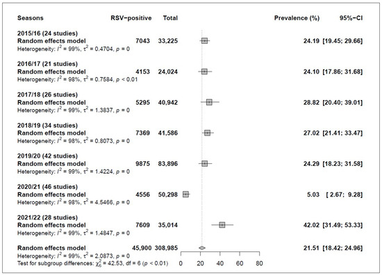 Regarding the subgroup analysis, the prevalence of RSV was significantly lower during the lockdown period than during the pre-pandemic period (5.03% [95% CI: 2.67; 9.28] vs. 25.6% [95% CI: 22.57; 28.88], p < 0.0001). Interestingly, the prevalence of RSV increased in the post-lockdown period after relaxing COVID-19 mitigation measures compared to the lockdown period (42.02% [95% CI: 31.49; 53.33] vs. 5.03% [95% CI: 2.67; 9.28], p < 0.0001). A detailed subgroup analysis is provided in Table 2.