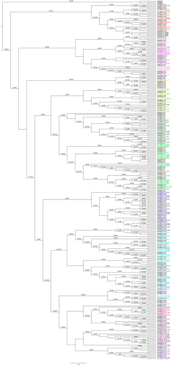 - Hoang, D.T.; Chernomor, O.; Haeseler AVon Minh, B.Q.; Vinh, L.S. UFBoot2: Improving the Ultrafast Bootstrap Approximation. Mol. Biol. Evol. 2017, 35, 518–522. [Google Scholar] [CrossRef]