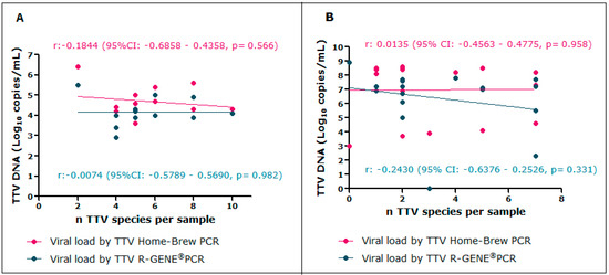 Association between the number of TTV species and TTV viral load. (A) Pearson’s correlation between the number of TTV species and TTV viral load pre-transplantation. (B) Pearson’s correlation between the number of TTV species and TTV viral load post-transplantation.