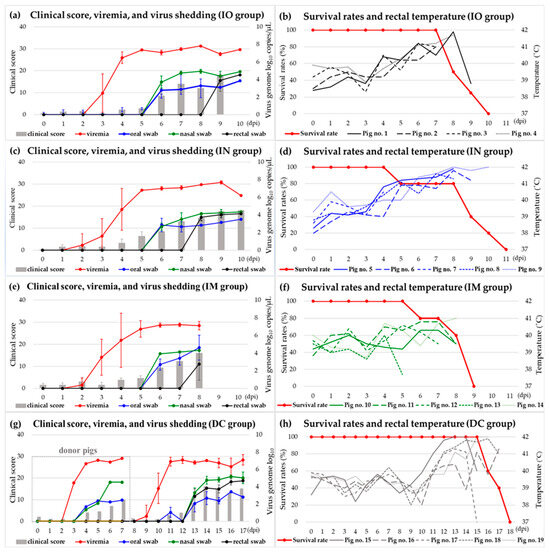 Results of evolution of the clinical score, viremia, and virus shedding via the oral, nasal, and rectal routes (a,c,e,g) and rectal temperature and survival rates (b,d,f,h) in the IO, IN, IM, and DC groups. IO, intraoral; IN, intranasal; IM, intramuscular; DC, direct contact; no., number.