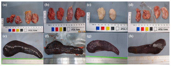 Gross lesions of spleen and lymph nodes. (a,b) Enlargement and hemorrhage in inguinal lymph nodes (pig nos. 4 and 19); (c) enlarged inguinal lymph node (pig no. 5); (d) enlarged and slightly hemorrhagic mandibular and inguinal lymph nodes (pig no. 14); (e,f) severely thickened, enlarged, dark, and friable spleen (pig nos. 1 and 18); (g) dark spleen (pig no. 5); and (h) spleen without any pathological lesions (pig no. 12).
