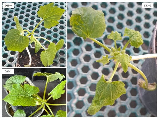 Following inoculation, we monitored by visual inspection the onset of ToLCNDV symptoms in zucchini plants treated with either the homologous dsRNA-V or the control dsRNA-C, or in those inoculated only with the virus. Typical ToLCNDV symptoms were evaluated according the DSI described in the Materials and Methods section (Figure 2).