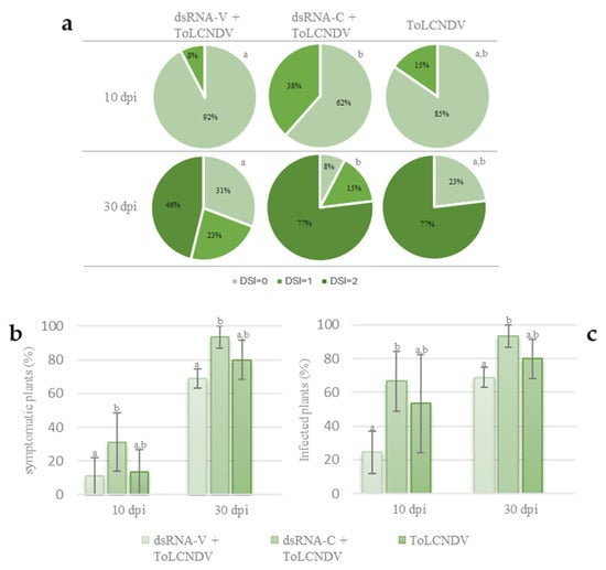 Efficacy of the dsRNA treatment against ToLCNDV on zucchini plants. (a) Graphic representation of the evaluation of symptoms caused by ToLCNDV in zucchini plants based on a disease severity index (DSI) ranging between 0 (no symptoms) and 2 (severe symptoms); different letters near the pie charts indicate statistically significant differences; (b) percentage of symptomatic plants according to visual symptoms evaluation; (c) percentage of infected plants according to molecular hybridization assay. Vertical lines on each bar represent standard errors. Different letters indicate statistically significant differences (p < 0.05, Mann–Whitney test).
