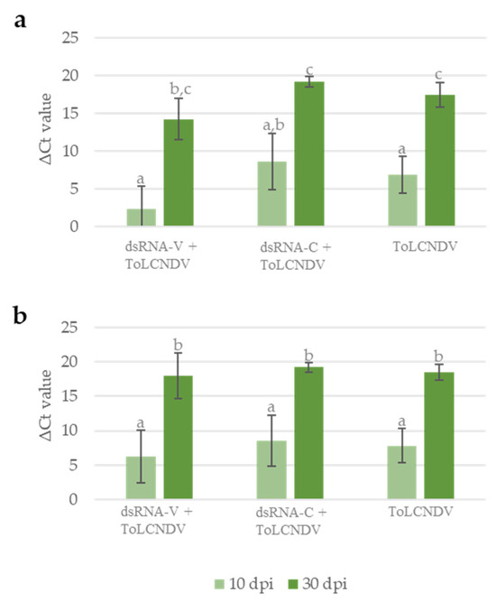 To further investigate the effect of exogenous dsRNAs on ToLCNDV infection, we measured the ToLCNDV titer in plants by qPCR. As shown in Figure 4a, at 10 dpi, the average quantity of viral DNA present in plants treated with dsRNA-V was similar to untreated plants, while the application of dsRNA-C apparently increased ToLCNDV accumulation. When plants were analyzed at 30 dpi, a slight reduction in the ToLCNDV titer was observed in dsRNA-V-treated plants in respect to dsRNA-C treated and untreated plants, even if an overall increase in the ToLCNDV titer, due to the progression of the infection, was recorded in all plants (Figure 4a).