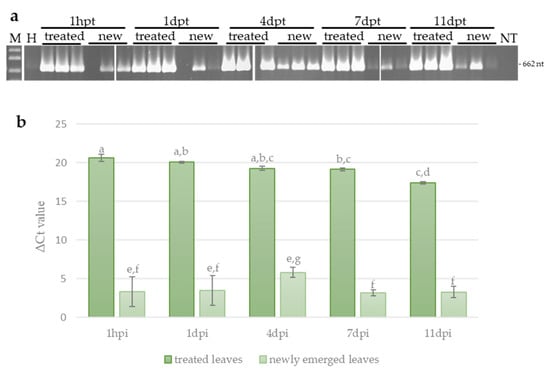 Persistence and systemic movement of dsRNA-V. (a) Detection of dsRNAs-V in treated leaves and untreated newly emerged leaves of zucchini at different time points by end-point PCR. NC, negative control (non-treated plants); NT, no template; hpt, hours post treatment; dpt, days post treatment; M, 1 kb plus DNA Ladder (New England Biolabs, MA, United States). Sizes of amplified fragments are shown on the side. (b) Quantification of dsRNA-V by qPCR. The Ct values obtained for the dsRNA were normalized with the Ct values obtained for the EF-1A transcript used as reference. Vertical lines on each bar represent standard errors. Different letters indicate statistically significant differences (p < 0.05, Kruskal–Wallis test).