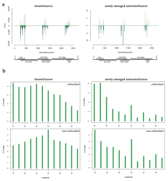 HTS analysis of sRNAs in dsRNA-treated (left panel) and newly emerged untreated (right panel) zucchini leaves, 4 days post treatment. (a) Distribution of dsRNA-V-derived sRNAs along the ToLCNDV DNA-A; sense and antisense sRNAs are reported in light and dark green, respectively; ORFs are represented along the viral genome; (b) length distribution of the sRNAs reads derived from the dsRNA-V.