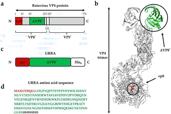 Rotavirus spike protein structure and graphical overview of a URRA. (a) Linear diagram of rotavirus VP4 spike protein (1–776 aa) showing the location of fragments VP8* (1–232 aa), VP5* (247–776 aa), ΔVP8* (65–223 aa), epitope ep8 (1–10 aa) (not to scale). VP4 fragment 232–247 aa is being removed during VP4 in vivo proteolysis. (b) Structural model of the rotavirus VP4 protein trimer showing fragment ΔVP8* and epitope ep8. The protein VP4 structure was visualised using Mol*, https://molstar.org/ (accessed on 6 February 2024). based on cryo-electron microscopy data (Protein Data Bank [PDB]: 6WXE). (c) Schematic representation of the URRA’s structure. (d) The amino acid sequence of a URRA. All images (a–d) use the following colour code: ΔVP8*, green; epitope ep8, red.