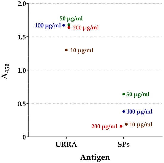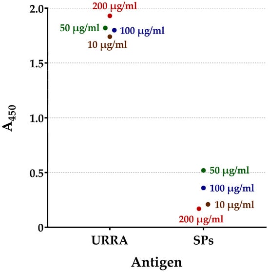 For the qualitative assessment of the interaction of URRA with Serum №1 and Serum №2, incubation and washing schedules were consistent with the protocol described by Kovalenko et al. (2022) [39]. URRA or SPs were used as an antigen for coating a 96-well plate in concentrations of 10 μg/mL, 50 μg/mL, 100 μg/mL, or 200 μg/mL. Analyses were conducted in two replicates for each antigen concentration for each serum analysed. Serum №1 or Serum №2 were used in a dilution of 1:100. Anti-mouse total IgG HRP conjugate (#ab6728, Abcam, Cambridge, UK) was used in a dilution of 1:10,000.
