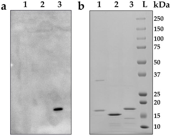 Interaction of URRA with antiserum to field rotavirus isolate (Serum №1). (a) Western blot analysis with primary antiserum №1 to field rotavirus isolate (1:500) and secondary HRP-conjugated antibodies (1:10,000). 1—SPs (negative control), 2—heterologous hexahistidine tag-containing recombinant protein (negative control), 3—URRA. (b) Electrophoresis analysis in 8–20% SDS-PAGE, staining by Coomassie G-250. 1—SPs (negative control), 2—heterologous hexahistidine tag-containing recombinant protein (negative control), 3—URRA, L—protein molecular weight markers ladder (molecular weights, in kDa, are indicated on the right).