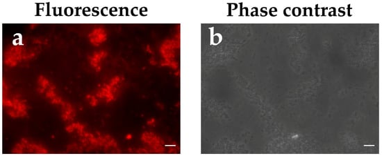 Immunofluorescence analysis of the URRA + SPs composition. (a,b) are the same image, presented in fluorescence and phase contrast modes, respectively. The URRA + SPs composition was obtained in PBS. The URRA:SPs mass ratio within the composition was 15:250. The URRA + SPs composition was treated with polyclonal mouse anti-URRA serum, obtained using Freund’s adjuvants and secondary antibodies conjugated to Alexa Fluor® 546. Scale bars, 5 μm. Negative controls are presented in Figure S1.