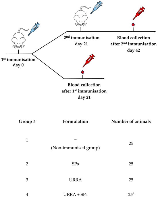 The immunisation of the mice was carried out to evaluate the immunogenicity of the vaccine candidate and the impact of SPs on the immunogenicity of the URRA. The immunisation schedule and a brief description of the groups of mice are presented in Figure 6. Four groups of mice, each consisting of 25 animals, were used in the experiment. Group 1 was not immunised and served as a control group. Groups 2, 3, and 4 were immunised with SPs (which served as an adjuvant control), URRA, or the URRA + SPs composition, respectively. For all groups, ten mice were immunised once, and blood was collected on the 21st day after immunisation; 15 mice were immunised twice, with a 21 day interval between immunisations, and the blood was collected on the 42nd day after the second immunisation.