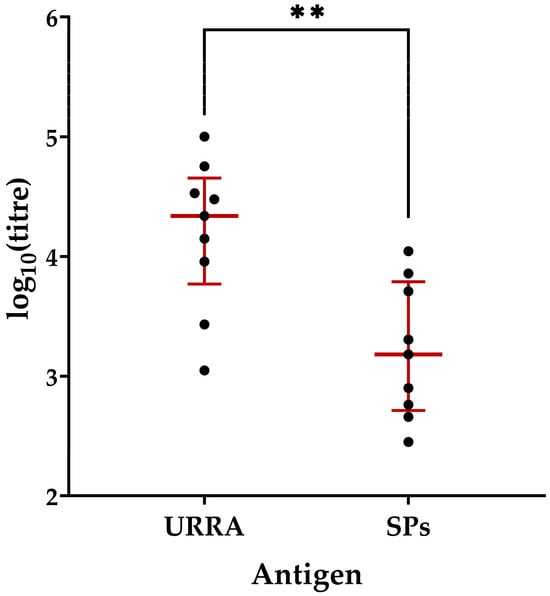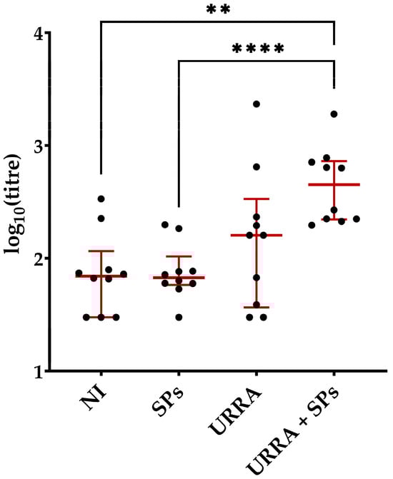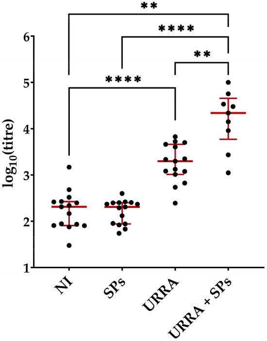 Comparison of anti-URRA and anti-SPs immune responses induced by the URRA + SPs composition after the second immunisation. The scheme of the study is presented in Figure 6. Sera titres were evaluated using indirect ELISA. The concentration of antigen used for adsorption on a microplate was 10 μg/mL. p-values were calculated using the Wilcoxon–Mann–Whitney Test. ●, IgG titres of individual mice; NI, non-immunised group; **, p < 0.01; —, median. Error bars represent the interquartile range. The complete data on anti-SPs sera titres for corresponding mice are presented in Table S9.