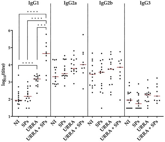 Comparison of anti-URRA IgG isotypes’ (IgG1, IgG2a, IgG2b, IgG3) titres in groups after the second immunisation. The scheme of the experiment is presented in Figure 6. Sera titres were evaluated using indirect ELISA. The concentration of antigen used for adsorption on a microplate was 10 μg/mL. p-values were calculated using the Wilcoxon–Mann–Whitney Test with the Holm–Bonferroni correction. ●, IgG isotype titres of individual mice; NI, non-immunised group; ***, p < 0.001; ****, p < 0.0001; —, median. Formulations used for the immunisation of corresponding groups of mice are marked under the horizontal axis. The IgG isotypes are marked above the corresponding graphs. The complete data on anti-URRA IgG1, IgG2a, IgG2b and IgG3 sera titres are presented in Tables S5, S6, S7 and S8, respectively.