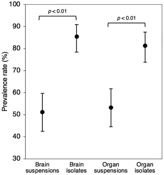 TBEV RNA prevalence rate in wild rodent brain and internal organ mix samples before (suspensions) and after (isolates) cultivation in murine neuroblastoma (Neuro-2a) cell line.