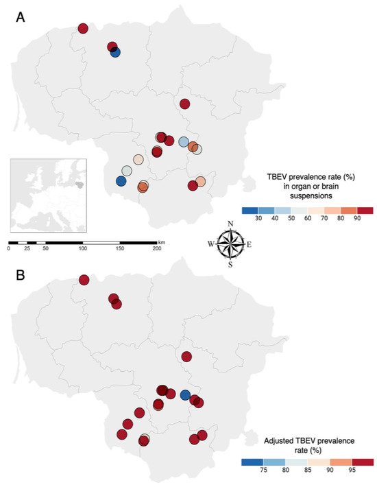 (A) Spatial distribution of sample collection sites and average TBEV RNA prevalence rate before isolation and (B) after isolation in Neuro-2a cells in different trapping locations in Lithuania. Viral RNA prevalence rate (%) in wild rodents is indicated by different colors shown in legends.