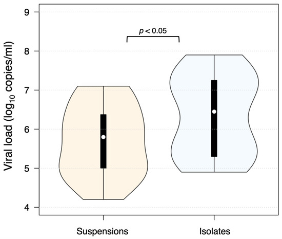 Viral load in the majority of brain and internal organ mix suspension samples was low, and in 70.1% of TBEV-positive suspension samples, amplification was observed at threshold cycle (Ct) values of 35–40. Brain and internal organ mix suspension samples (n = 30) with the lowest Ct value and respective rodent sample isolates in cells (n = 30) were taken, and viral load was measured (Figure 3). The average viral load in the same rodent’s Neuro-2a cell culture isolates was significantly higher (p < 0.05) than in the respective tissue suspension samples (6.4 log10 copies/mL and 5.7 log10 copies/mL, respectively). The results demonstrate successful TBEV isolation in cell culture and confirm viable virus presence in rodent tissue samples.