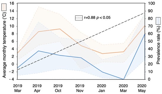 A strong correlation (r = 0.88; p < 0.05) was found between average monthly air temperature and TBEV RNA prevalence rate in cell culture isolates of rodent suspensions, which were PCR-negative before cultivation (Figure 4). The detected viral RNA prevalence rate in isolates of brain and internal organ mix samples, which were PCR-negative prior to cultivation, was significantly higher in rodents trapped when the average monthly air temperature was higher than 5 °C.