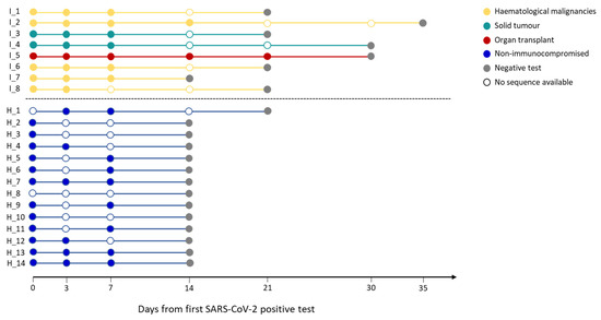 Infection length in immunocompromised and non-immunocompromised subjects. The figure reports the length of the SARS-CoV-2 infection in eight immunocompromised (Group 1) patients and in fourteen non-immunocompromised subjects at high risk of COVID-19 clinical progression (Group 2). The infection length is defined as the time window spanning from the first day of nasopharyngeal test positivity (day 0) to the first negative nasopharyngeal test. Group 1 subjects are reported in blue, whereas the different immunocompromised subjects are coloured according to the type of compromising condition, provided in the legend. The first negative test is presented as a grey dot. The other dots represent each day at which the subjects were tested, with filled dots indicating the availability of the viral sequence for that timepoint.