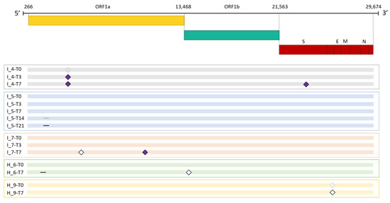 Emergence of SARS-CoV-2 consensus mutations in immunocompromised and non-immunocompromised subjects. The figure shows the longitudinal emergence of viral mutations in three immunocompromised (I) and in two non-immunocompromised (H) subjects. The longitudinal viral sequences of each patient are enclosed in a coloured box and are presented as coloured bars. Only the novel intra-host mutations compared to T0 are reported. Non-synonymous mutations are depicted as purple-filled diamonds, while silent mutations are presented as white diamonds. Deletions are indicated as black lines. Shaded mutations represent mutations present with a frequency below 50%.