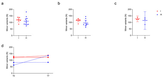 Quantitative analysis of minor variants. Comparison of the number of minor variants identified in immunocompromised (I) and in non-immunocompromised (H) subjects. (a) Comparison of the number of minor variants identified in immunocompromised and non-immunocompromised subjects, regardless of the timepoint at which the samples were collected (NI = 7, Mean I = 120.3, NH = 11, Mean H = 110. 0, p = 0.46, unpaired t test). (b) Comparison of the number of minor variants identified in immunocompromised and non-immunocompromised subjects at T0 (NI = 7, Mean I = 115.3, NH = 9, Mean H = 95.89, p = 0.10, unpaired t test). (c) Comparison of the number of minor variants identified in immunocompromised subjects and non-immunocompromised subjects at T7 (NI = 3, Mean I = 127.7, NH = 3, Mean H = 115.0, p = 0.49, unpaired t test). (d) Longitudinal intra-host variation of the number of minor variants identified in subjects for which T0 and T7 samples were available (NI = 3, NH = 2). The number of minor variants detected in each sample of an immunocompromised subjects are reported as red dots. Conversely, the number of minor variants detected in each sample of a non-immunocompromised subject are reported as blue dots, according to the legend.