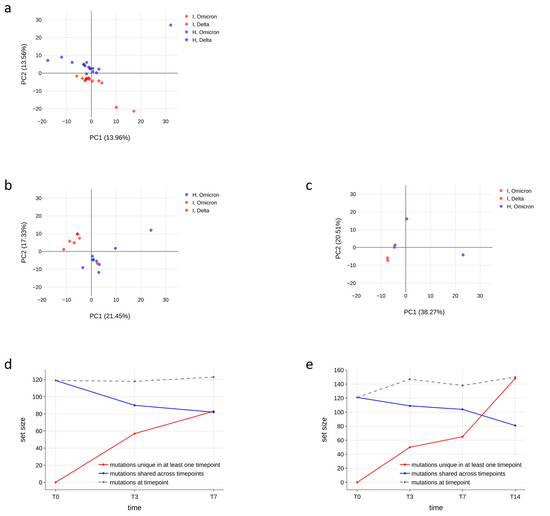 After demonstrating that the number of minor variants did not differ between immunocompromised and non-immunocompromised subjects, we assessed whether the type of mutations and their frequency were different in the two groups by performing a principal component analysis. Firstly, we ensured that, among the immunocompromised subjects, there was no difference in the minor variant profiles according to the SARS-CoV-2 variant of infection (Figure S4b). Then, we investigated the impact of age (Figure S5b–d) and treatments (Figure S6b–d) on the profiles of minor variants. Finally, we generated a principal component analysis for all samples at T0, at T7 and regardless of the timepoints, considering the type and frequency of minor variants identified in each sample (Figure 5a–c). As a result, data did not cluster differently according to the immunological status. Although in some panels, such as panel a, most of the data seem to cluster in two different groups, the variance explained by the first two principal components is very low (less than 30%), further confirming the absence of a significant difference in the minor variant profiles of immunocompromised subjects compared to non-immunocompromised ones. Moreover, we monitored the conservation of low-frequency mutations over time in two immunocompromised patients to understand the dynamics of viral quasispecies composition. As shown in Figure 5d–e, the number of mutations fluctuates but is relatively stable between consecutive timepoints (grey dashed lines); nonetheless, there are always new mutations appearing (red lines in the plots) and replacing a portion of those that were present in previous samples (blue lines), suggesting that the quasispecies population undergoes intense renewal, especially in persistent infections.