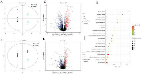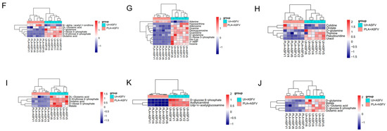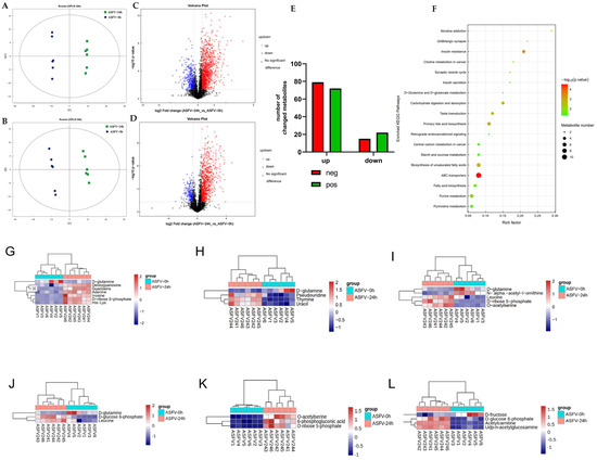 The metabolic analysis of cells infected with ASFV and control for 24 h was carried out by the APTBIO firm in Shanghai, China, using LC-MS technology. The culture medium from the cultured PAM cells (~107 cells per sample) was removed using a pipette. Then, the cells were washed with PBS under 37 °C, and the PBS was removed. Then, 800 μL of cold methanol/acetonitrile (1:1, v/v) was added to remove the protein and extract the metabolites. The mixture was collected into a new centrifuge tube, and centrifugation was performed at 14,000× g for 5 min at 4 °C to collect the supernatant. The supernatant was dried in a vacuum centrifuge. For LC-MS analysis, the samples were redissolved in 100 μL of acetonitrile/water (1:1, v/v) solvent. For studying the untargeted metabolomics of polar metabolites, the extracts were analyzed using a quadrupole time-of-flight mass spectrometer (Sciex TripleTOF 6600) with the spectrometry method coupled to hydrophilic interaction chromatography via electrospray ionization at Shanghai Applied Protein Technology Co., Ltd. (Shanghai, China) LC separation was accomplished on an ACQUIY UPLC BEH Amide column (2.1 mm × 100 mm, 1.7 µm particle size (waters, Ireland) using a gradient of solvent A (25 mM ammonium acetate and 25 mM ammonium hydroxide in water) and solvent B (acetonitrile). The gradient was 85% B for 1 min and was linearly reduced to 65% in 11 min; then, it was reduced to 40% in 0.1 min and kept for 4 min and then increased to 85% in 0.1 min, with a 5 min re-equilibration period employed. The flow rate was 0.4 mL/minute, the column temperature was 25 °C, the autosampler temperature was 5 °C, and the injection volume was 2 µL. The mass spectrometer was operated in both negative and positive ion modes. The ESI source conditions were set as follows: ion source gas 1 (Gas1) as 60; ion source gas 2 (Gas2) as 60; curtain gas (CUR) as 30; source temperature, 600 °C; IonSpray Voltage Floating (ISVF), ±5500 V. In MS acquisition, the instrument was set to acquire over the m/z range of 60–1000 Da, and the accumulation time for the TOF MS scan was set at 0.20 s/spectra. In auto MS/MS acquisition, the instrument was set to acquire over the m/z range of 25–1000 Da, and the accumulation time for the product ion scan was set at 0.05 s/spectra. The product ion scan was acquired using information-dependent acquisition (IDA) with a high-sensitivity mode selected. The parameters were set as follows: the collision energy (CE) was fixed at 35 V with ±15 eV; the declustering potential (DP) was 60 V (+) and −60 V (−); isotopes within 4 Da were excluded, and the number of candidate ions to monitor per cycle was 10.