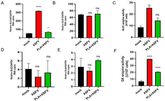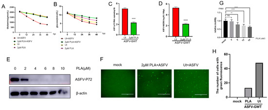 18]. To verify the effect of PLA on viral replication, we used PLA to treat PAM cells, which slowed down the rate of glutamine uptake and stopped the replication of ASFV. This suggests that PLA can be used as a natural small-molecule compound for antiviral purposes. ASFV needs to hijack the host metabolism for its own replication. Nucleotides and amino acids are used as raw materials for the replication and synthesis of progeny viruses, which are related to glutamine metabolism. Therefore, in order to explore the effects, we performed metabolomics analysis, and the results showed that PLA pretreatment significantly reduced the metabolic flux of glutamine, nucleotide metabolism (including purine and pyrimidine metabolism), and amino acid biosynthetic flux, and therefore reduced the raw material for ASFV replication at the feedstock level. Thus, the replication level of ASFV was reduced.