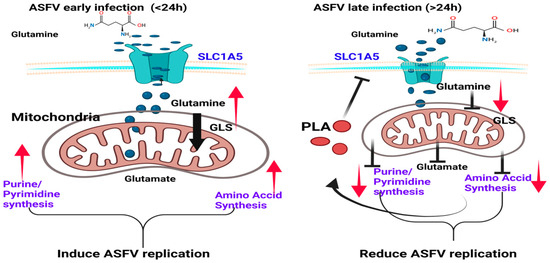 In the early stage of ASFV infection, the virus hijacks and increases the host’s glutamine and glucose metabolism to promote viral replication, while PLA accumulates over time and gradually reduces the transcription of glutamine transporter and the activity of GLS, a key enzyme in glutamine metabolism, in the late stage of ASFV infection, thereby reducing the level of glutamine metabolism. Affected by the decrease in glutamine metabolism, glutamine-related metabolic pathways, including amino acid bio-anabolism and nucleotide metabolism, also weaken. Thus, the biosynthetic precursors used for ASFV replication are reduced to effectively inhibit ASFV replication (