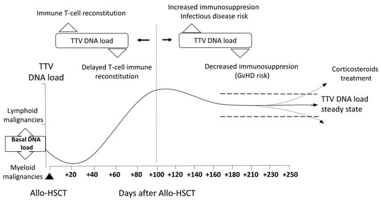 Data published on the kinetics of TTV DNAemia following allo-SCT tend to concur (depicted in Figure 1). TTV DNA load decreases after allo-SCT until engraftment, which appears to be linked to the depletion of lymphoid cells that occurs within the first weeks after transplantation [27,34]. Afterward, TTV DNA loads steadily rise reaching the peak 2–3 months after allo-SCT, this mirroring, to some extent, the reconstitution of the lymphoid cell pool [27,28,29,37]. Namely, Albert et al. [27] found the TTV DNA load to peak around day +90 (up to 7 log10 copies/mL), Wohlfarth et al. [28] at day 79 (up to 8 log10 copies/mL), Schmitz et al. [29] between days +90 and +105 (median, 5 log10 copies/mL), Spiertz et al. [30] at day +56 (median around 7 log10 copies/mL), and Pradier et al. [37] at day 100 (median 6.4 log10 copies/mL). Importantly, by day +100, virtually all allo-SCT recipients tested positive for TTV DNA. After day +100, the TTV DNA load slightly decreases, followed by a stable plateau over one year after transplantation [27,28,29,30,36].
