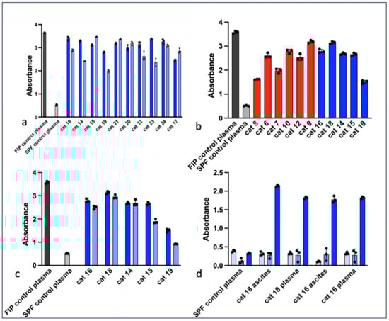 FIPV-infected cells were lysed and the protein quantified with a BCA Protein Assay Kit (Prometheus), per the manufacturer’s instructions, using a microplate assay. A 96-well ELISA plate was coated with 250 ng of viral protein per well. Effusion and plasma from study cats were diluted at 1:800. FIPV3-70 FIP/CCV monoclonal antibodies (1:500 dilution) were used as positive controls, and plasma from an SPF cat (1:800 dilution) was used as a negative control. One hundred microliters of primary antibody dilution was added to each well and incubated for 2 h at room temperature. Next, 100 µL of secondary antibody (1:3000 dilution) was applied, using goat anti-cat IgG(Fc) JD-HRP for the study cat specimens and the negative control and goat anti-mouse IgG-HRP for the FIPV3-70 FIP/CCV positive control. The plate was incubated at room temperature for 1 h. One hundred microliters of room-temperature single-component TMB Peroxidase ELISA substrate (cat# 1721068, BioRad) was added to each well. The plate was covered in foil and incubated at room temperature for 10 min, until sufficient blue chromogen developed within the positive control wells. The reaction was stopped with 50 microliters of 0.5 M H2SO4 per well. The absorbance of the plate was read with a spectrophotometer plate reader (SpectraMax 340, Molecular Devices) at wavelengths 450 nm and 595 nm.