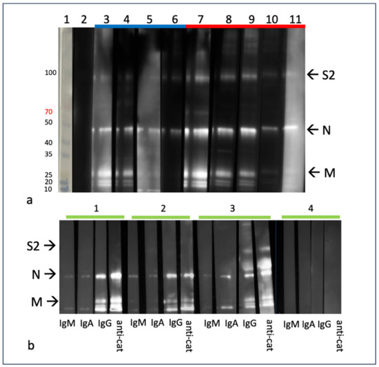 Western blot (immunoblot) assays demonstrating anti-FCoV responses from cats with FIP. FCoV N protein (~43 kDa), M protein (~25 kDa) and S2 (~90 kDa) are labeled with the corresponding letter. (a) Western blot assay demonstrating total Ig binding to FCoV proteins for study cats. Cats that successfully entered remission are indicated by the blue bar (lanes 3–6), and cats that died or were euthanized are indicated by the red bar (lanes 7–11). Lane 1—molecular weight markers, lane 2—SPF negative control plasma, lane 3—cat 14, lane 4—cat 15, lane 5—cat 16, lane 6—cat 17, lane 7—cat 9, lane 8—cat 12, lane 9—cat 10, lane 10—cat 7, lane 11—cat 11. (b) Western blot assay demonstrating Ig subtype binding for a subset of study cats. Lane 1—cat 18, lane 2—cat 14, lane 4—cat 19, lane 5—SPF feline plasma (negative control).