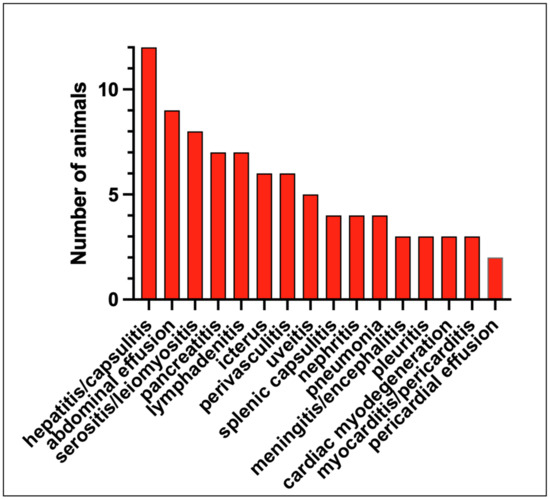 Pathologic lesions identified in the 13 study cats that were euthanized or succumbed to disease are listed in Table 1 and Figure 3 and are depicted in Figure 4, Figure 5 and Figure 6. The pathologic lesions identified in cats treated with antivirals (Table 1, yellow boxes) and those that died without antiviral treatment (blue boxes) were similar. The most common pathologic lesions identified, in frequency of occurrence, were hepatitis/capsulitis, abdominal effusion (ascites), serositis/leiomyositis, pancreatitis, lymphadenitis, icterus, perivasculitis and uveitis (Figure 3). These lesions are typical of cats with FIP and are depicted in Figure 5 (gross) and Figure 6 and Figure 7 (histopathology).
