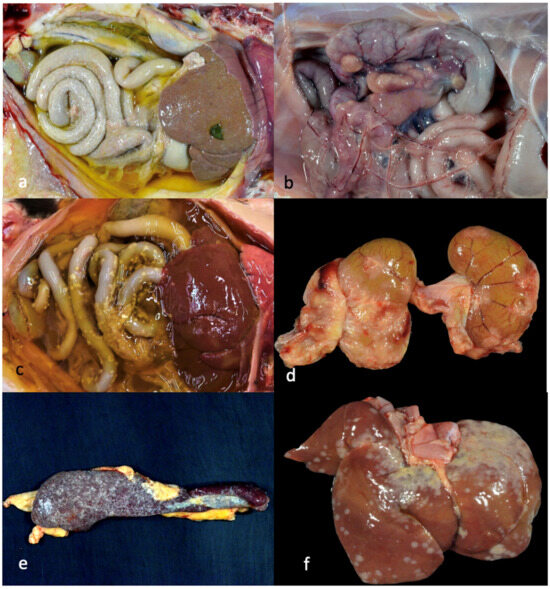 Select gross lesions identified in the necropsied cats with FIP. (a) Open abdomen demonstrating icterus, abdominal effusion, fibrinous serositis and hepatic capsulitis (wet/effusive FIP, 4 days of antiviral (AV) treatment, cat 8). (b) Open abdomen demonstrating granulomatous mesenteric lymphadenitis/lymphadenomegaly (dry/granulomatous FIP, untreated cat 3). (c) Open abdomen and thorax demonstrating abdominal effusion, icterus and serositis (wet/effusive FIP, 3 days of AV treatment, cat 6). (d) Bilateral kidneys demonstrating granulomatous nephritis and capsulitis (dry/granulomatous FIP, 6 days of AV treatment, cat 10). (e) Spleen demonstrating splenic capsulitis (4 days of antiviral treatment, cat 8). (f) Liver demonstrating hepatic capsulitis (1 day of antiviral treatment, cat 4).