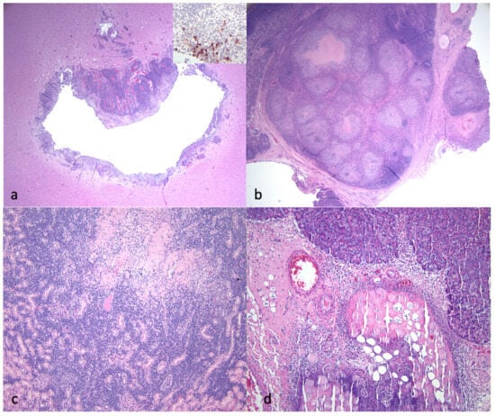 Select histological lesions identified in the necropsied cats with FIP. (a) Section of brainstem demonstrating periventriculitis and encephalitis. The inset image demonstrates higher magnification of an IHC for FCoV antigen (+++ viral antigen, untreated cat 3). (b) Mesenteric lymph node with necrotizing lymphadenitis lesion. IHC for FCoV demonstrated abundant viral antigen (IHC not shown, untreated cat 3). (c) Kidney demonstrating necrotizing interstitial nephritis (6 days of antiviral treatment, cat 5). (d) Pancreas demonstrating necrotizing pancreatitis and steatitis (5 days of antiviral treatment, cat 9).