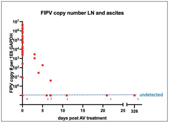 FCoV nucleic acid quantification in lymph nodes and effusions in response to antiviral therapy. Numbers along the “undetected” dotted line refer to the number of cases with no FCoV RNA detected at that specific time point.