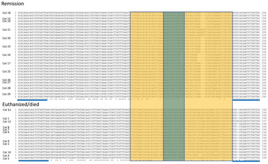 S1/S2 nucleotide sequences for the FCoV spike gene. Sequences derived from study cats that successfully entered remission are listed in the upper block, while those derived from cats that died or were euthanized are listed in the lower block. Individual cat numbers are listed on the left, and 1–3 sequences are depicted per animal as a, b or c. The hypervariable region (yellow) flanks the S1/S2 sequence (green). Primer sites are indicated by blue lines. Asterisks (*) indicate conservation of the nucleotide sequence at that locus.