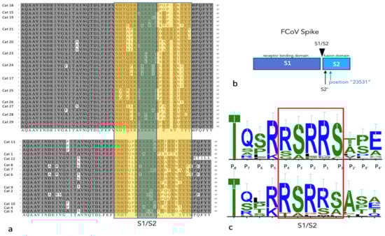 S1/S2 amino acid sequences for the FCoV spike gene. (a) Sequences are organized as in Figure 8. (b) A schematic of the FCoV S protein demonstrating the S1 and S2 portions and the cleavage sites and locus 23,531. (c) The relative frequency of the amino acids at each locus are depicted in this WebLogo 3.1 analysis (http://weblogo.threeplusone.com/create.cgi (accessed on 1 June 2023)). The S1/S2 site is boxed in red.