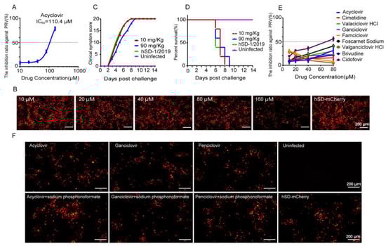 Of the 30 previously reported PRV-infected patients, 15 received antiviral medication containing acyclovir, 5 received antiviral medication containing ganciclovir, and 1 received antiviral medication containing penciclovir. However, the efficacy of these drugs against PRV remains to be studied given their poor final outcomes [24]. Subsequently, the efficacy of several clinical anti-herpesvirus medications against the human-origin PRV variant strain hSD-1/2019 were evaluated in this study. The IC50 of acyclovir against hSD-1/2019 was determined to be 110.4 μM (Figure 2A). At a concentration of 160 μM, acyclovir significantly attenuated the fluorescence intensity of PK-15 cells infected with hSD-mCherry compared to the lower concentrations (Figure 2B). However, noticeably, the IC50 values of acyclovir against herpes simplex virus type-1 and Varicella Zoster virus were both less than 10 μM [25,26], indicating much higher susceptibility to acyclovir than the PRV variant strain hSD-1/2019. The anti-PRV effect of acyclovir was further investigated in mice challenged with a lethal dose of hSD-1/2019. Mice that received no medication showed severe neurological symptoms and 100% mortality, while those treated with acyclovir at doses of 10 mg/Kg and 90 mg/Kg had the same clinical symptom scores and mortality rates as the untreated group, indicating that acyclovir did not protect mice from lethal PRV infection (Figure 2C,D).