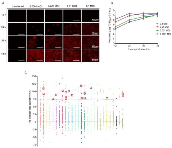 A high-throughput method was developed based on the fluorescently labeled PRV strains described above. The optimization results for inoculation dose and infection time demonstrated that cells infected with Ea-mCherry at 0.01 MOI for 36 h exhibited peak fluorescence intensity and virus titers, which remained stable (Figure 3A,B). Accordingly, the established high-throughput method for drug screening involved infecting PK-15 cell monolayers in 96-well plates with Ea-mCherry at 0.01 MOI, followed by treatment with a 10 μM drug. Cells infected with PRV served as the infection control group. After incubation for 36 h, the fluorescence intensity of cells was measured using a multimode microplate reader instrument with excitation light at 587 nm and emission light at 610 nm. The inhibition ratio of the drug against Ea-mCherry was calculated as the percentage difference in fluorescence intensity between infected cells and drug-treated cells.