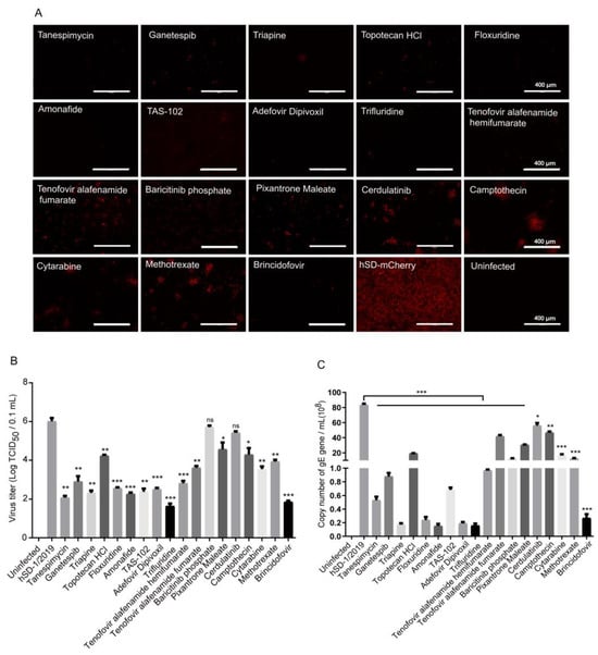 The inhibitory activity of 18 candidate drugs against PRV was evaluated in vitro. (A) PK-15 cells were infected with hSD-mCherry at an MOI of 0.01 and treated with the 18 drugs at a concentration of 10 μM. After 36 h of infection, the fluorescence intensity of the cells was observed; (B,C) viral gE gene copies and virus titers were quantified using TaqMan qPCR and TCID50 determination, respectively. All data were presented as the mean ± standard deviation from three independent analyses. Statistical analysis using Student’s t-test was performed to determine significant differences between the hSD-mCherry-infected group and the medication group. A level of 0.01 < p < 0.05 (*) was considered significant, and p < 0.01 (**) or p < 0.001 (***) was considered statistically highly significant and extremely significant, respectively. p > 0.05 (ns) was considered not significant.