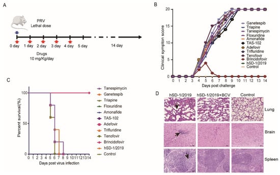 Therapeutic effect of the 10 drugs in mice infected with a lethal dose of hSD-1/2019 (A) Schematic diagram of the mouse model. The red arrows indicate drug medication and the blue arrow indicates the virus challenge. Mice were challenged with PRV hSD-1/2019 at 500 TCID50 via hind foot pad injection. The medication groups were intraperitoneally treated with the drugs at a daily dose of 10 mg/Kg for five days. The observation period lasted for 14 days; (B) clinical symptoms in each group were scored daily and the total score of mice in a group is displayed, where higher scores indicate more severe clinical symptoms. A score of 20 represents death of all 5 mice in a group; (C) survival curve analysis was performed using Kaplan–Meier survival plots to evaluate the survival rates among different groups. The color lines represent different drug treatment groups; (D) histopathological examination was conducted on lung, brain and spleen tissues collected from three groups when mice died in the hSD-1/2019 group.