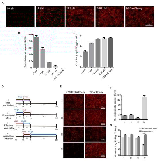 The time-of-addition assay was performed to determine the stage of viral replication cycle targeted by the drug by adjusting the order in which the drug and viruses were added into cells. During all the experiments, monolayer PK-15 cells in 96-well plates were infected with PRV-mCherry at an MOI of 0.01 and treated with the drug at 10 μM. (I) Virus inactivation: The mixture of viruses and drug was incubated at 37 °C for 1 h and then added to the cells for continued incubation. After 36 h, the cultures were collected. (II) Pre-treatment effect: A concentration of 10 μM of the drug was added to the cells for 1 h of incubation at 37 °C and then replaced by the viral suspension. The cells were covered with fresh medium 1 h post infection and incubated for 36 h before harvesting. (III) Virus internalization: The cells were infected with PRV-mCherry and incubated at 4 °C for 1 h. Then, the supernatant was replaced with the drug, followed by 1 h of incubation at 37 °C. The drug was removed and fresh medium was added. The cultures were collected after 36 h. (IV) Virus replication: The cells were infected with PRV-mCherry and incubated at 37 °C for 1 h. Then, the supernatant was replaced with the drug and the cells were incubated at 37 °C for 36 h before collection. These collected cultures were applied for fluorescence intensity detection and virus titer determination.