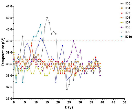 Body temperature during the trial of the six buffaloes and two calves. Buffaloes were identified from ID3 to ID8, while cattle were identified with ID9 and ID10. In cattle ID10, fever had a biphasic course: on day 4, it was 39.7 °C, it rose to 40.2 on day 7, then decreased to 39.5 on day 8, and finally increased again from day 9 to day 10, when it was 40.4 °C.